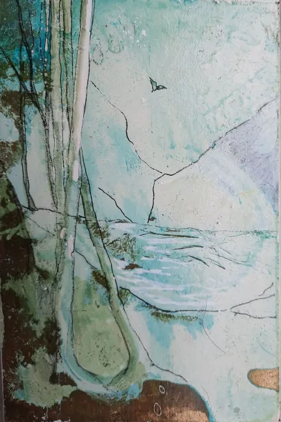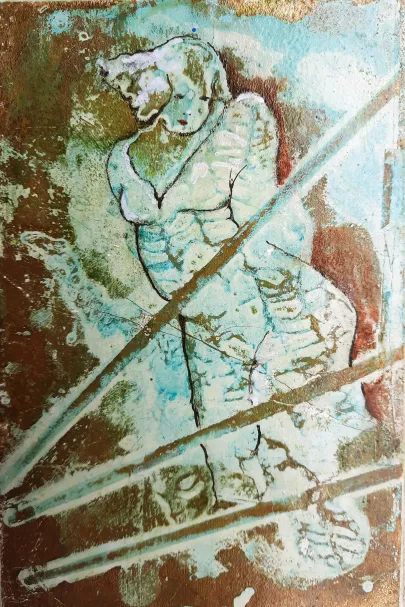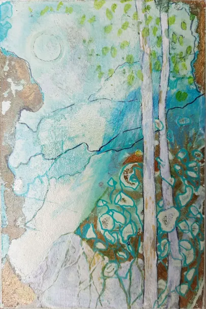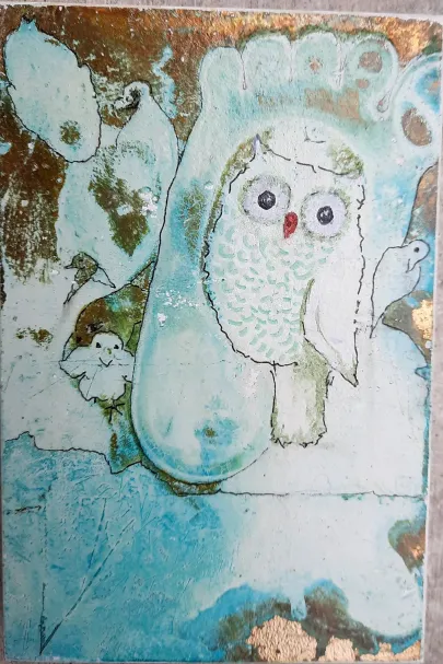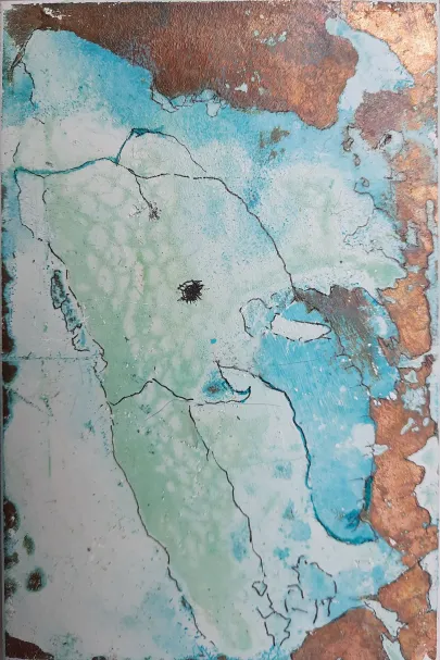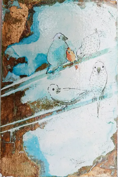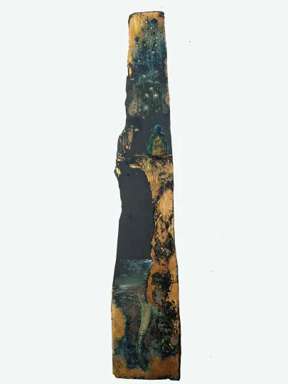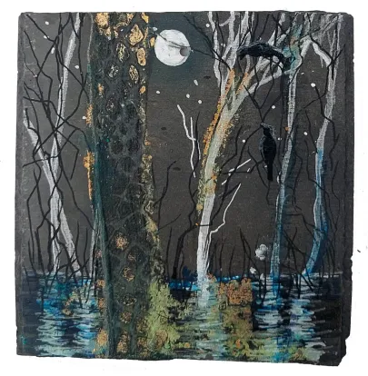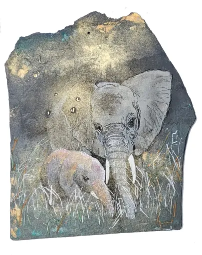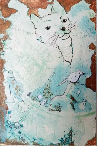 Skifer (fra Wales - verdens fineste skifer. Gl. kirketag fra Galten Kirke). Akryl og forgyldning og ætsning. Dyr i massevis.a bit of summer