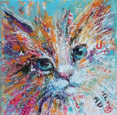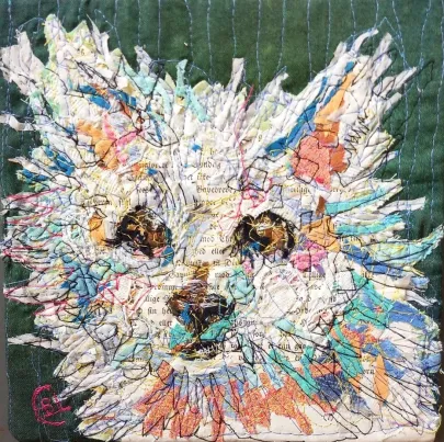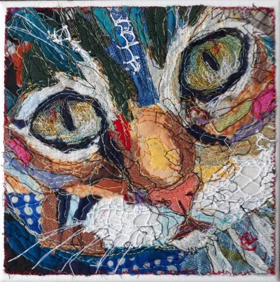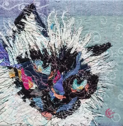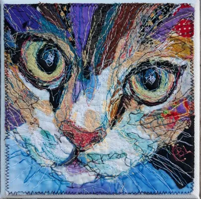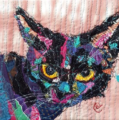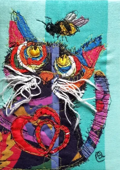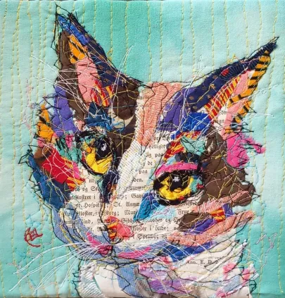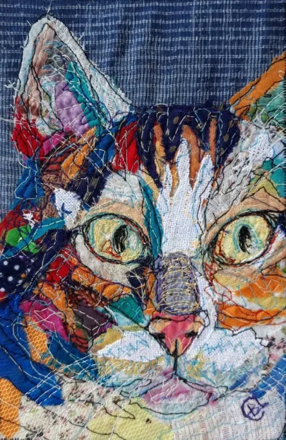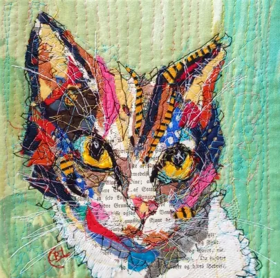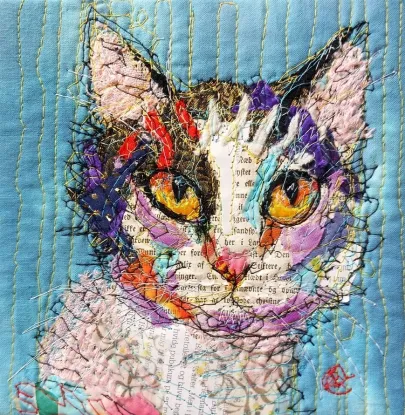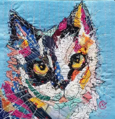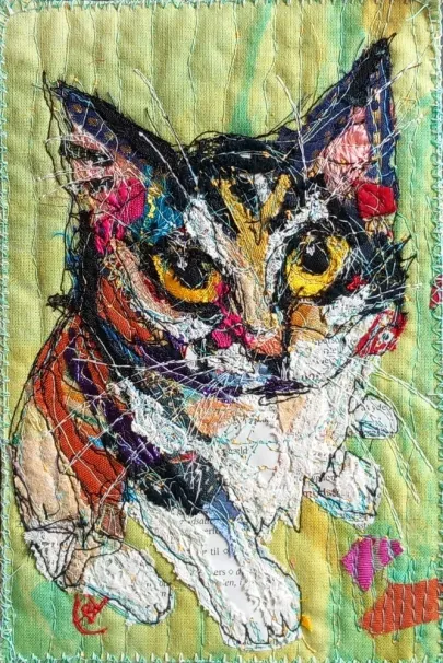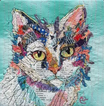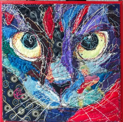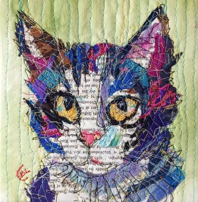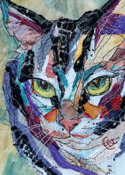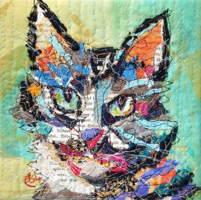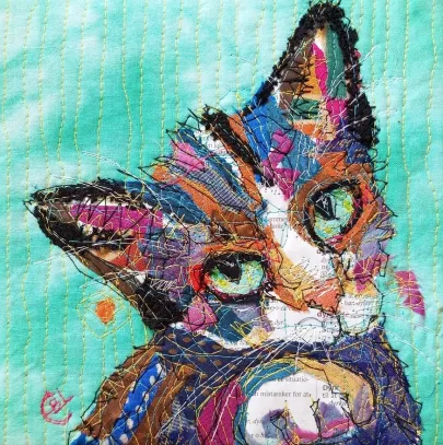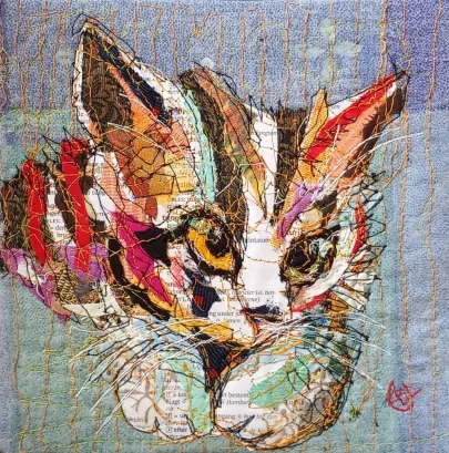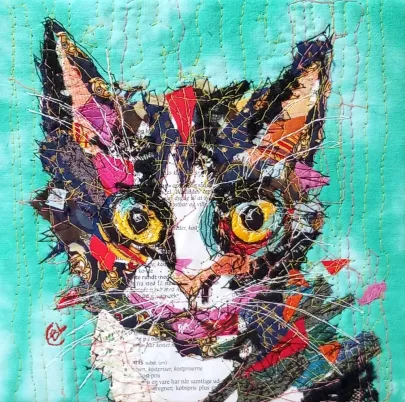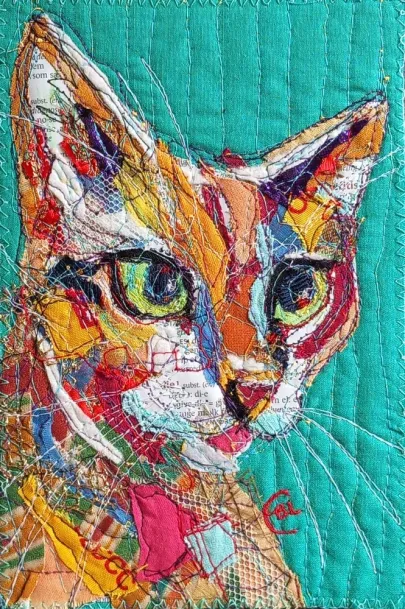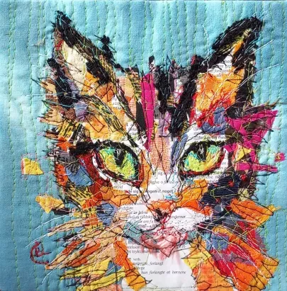 I draw and paint every day, mostly cats from a local shelter, as I donate every time I sell an art piece. Often I use my drawings as reference when doing free-motion quilted collages on my sewing machine. I like the spontaneity in the pieces, hence I often find the right bit of fabric on the floor, and cut it with an old pair of scissors, to achieve the abstract look.