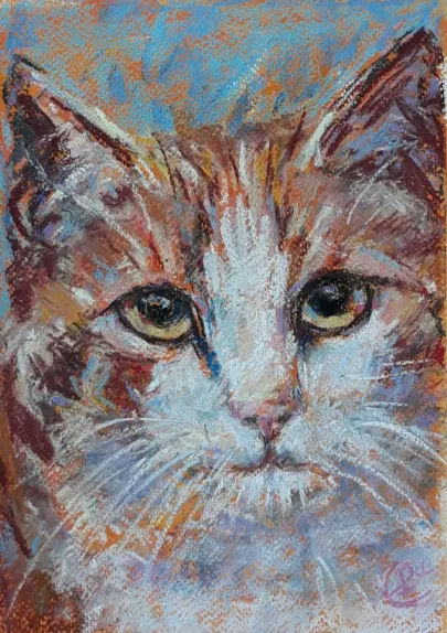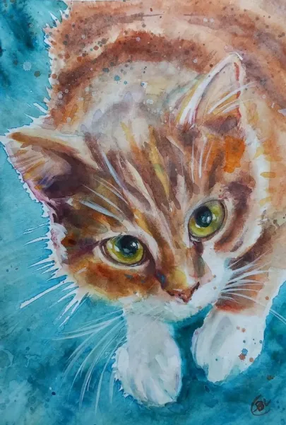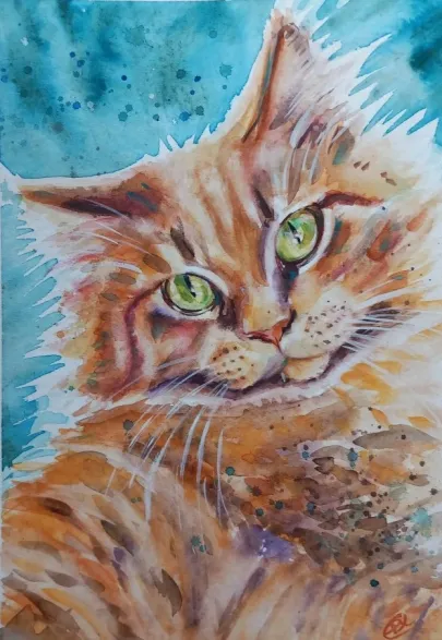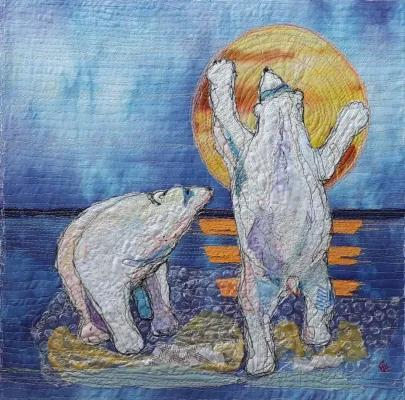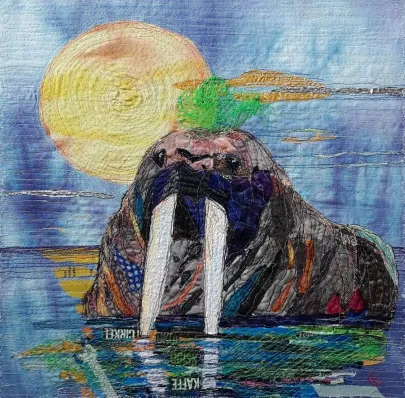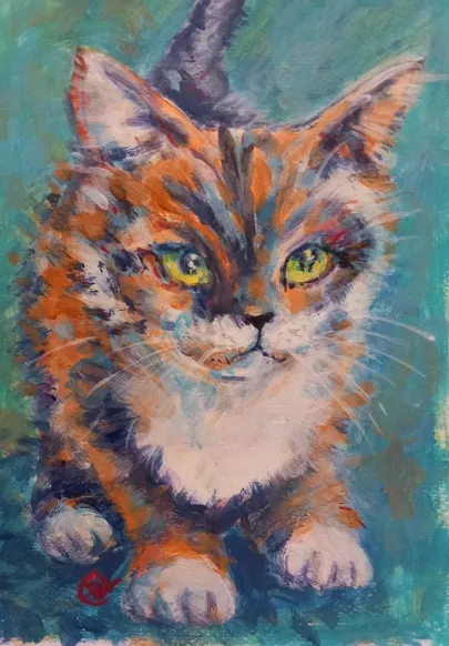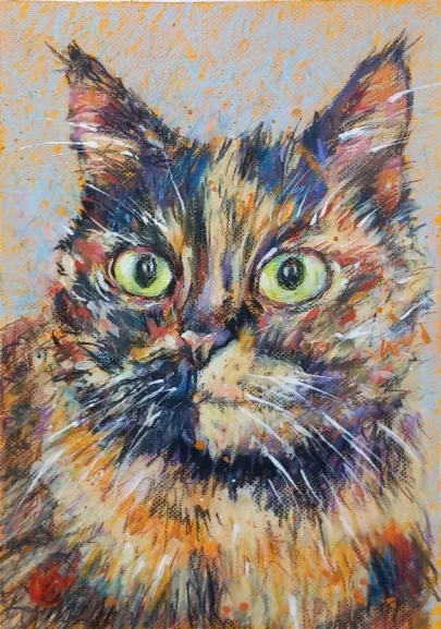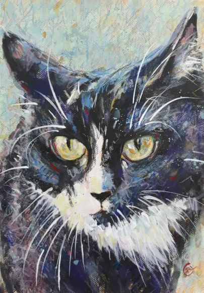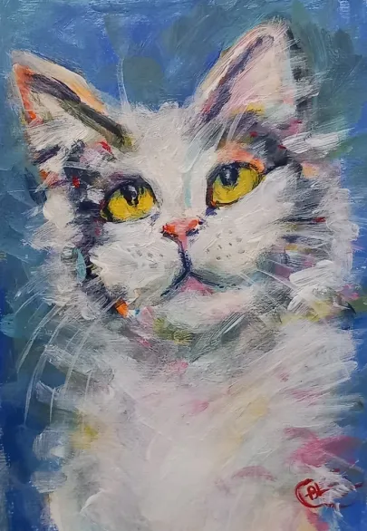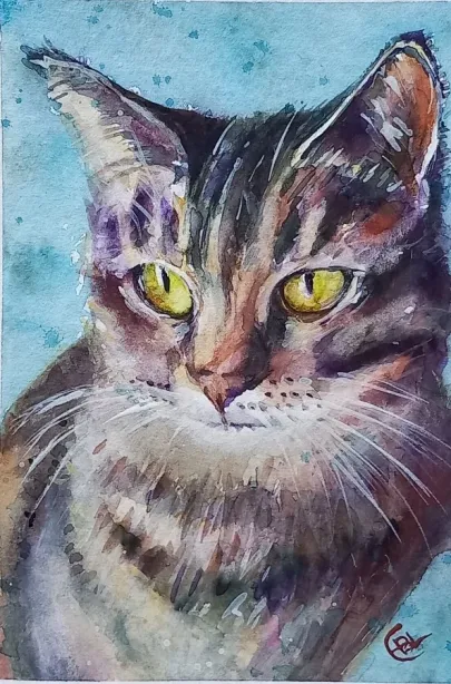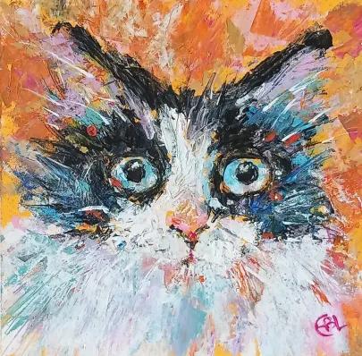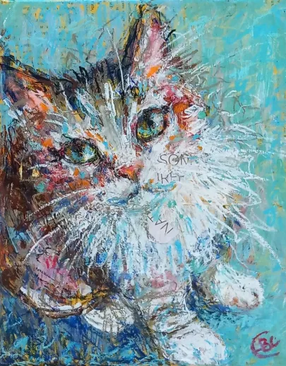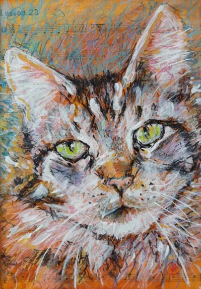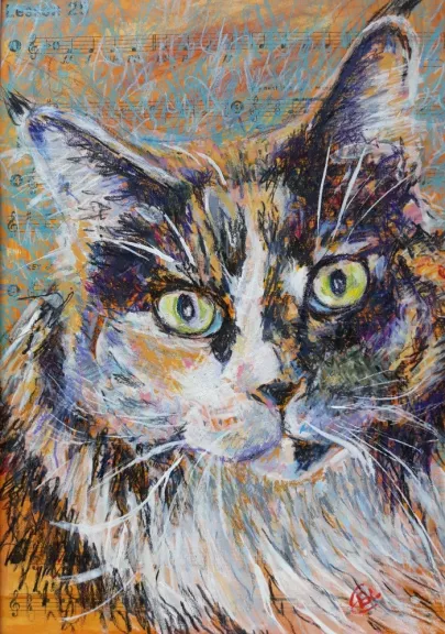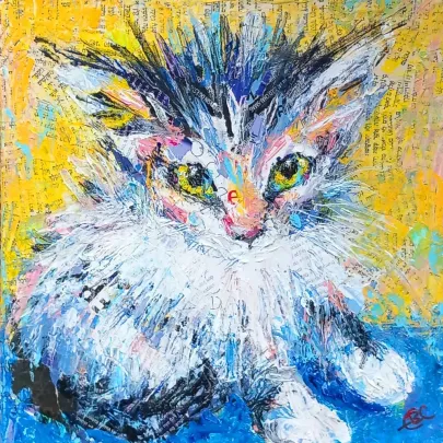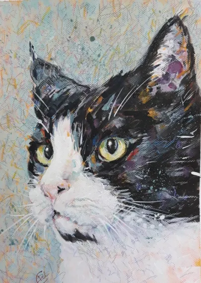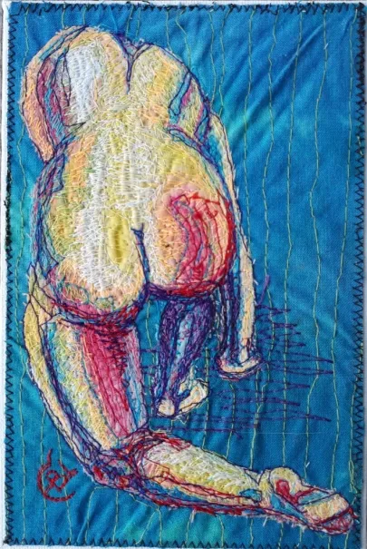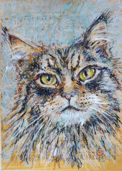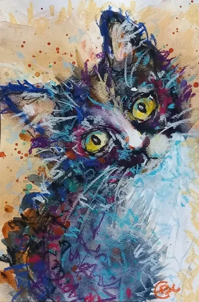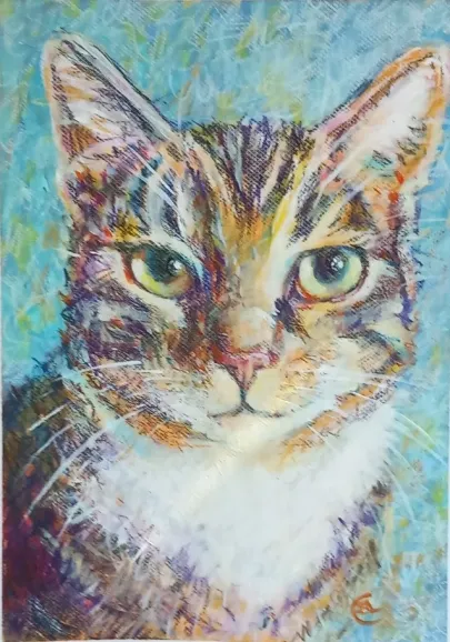 I draw and paint every day, mostly cats from a local shelter, as I donate every time I sell an art piece. Often I use my drawings as reference when doing free-motion quilted collages on my sewing machine. I like the spontaneity in the pieces, hence I often find the right bit of fabric on the floor, and cut it with an old pair of scissors, to achieve the abstract look.
