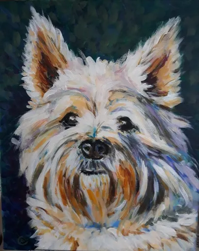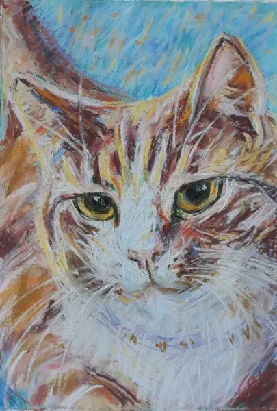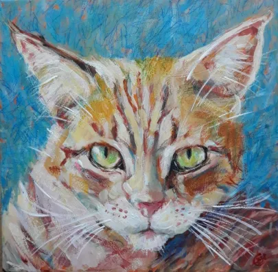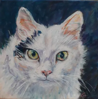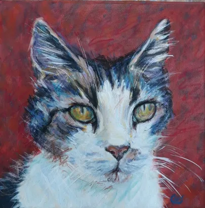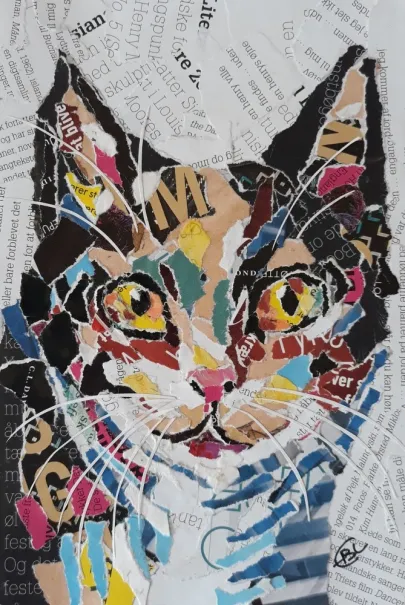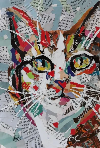 Mit værkstedJeg tegner og maler hver dag, for det meste katte fra et lokalt kattehjem, da jeg donerer hver gang jeg sælger et værk. Ofte bruger jeg mine tegninger til at sy efter. Jeg kan lide det spontane i værkerne, finder af og til lappen med den helt rigtig farve på gulvet. og bruger en dårlig saks, for at opnå det abstrakte udtryk det giver.