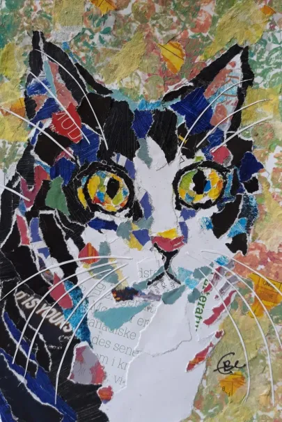 Else paints, draws and sews fabric collages of mainly cats, but other animals and people also appear in her pictures. The works are colorful, because the interanction of colors are very important. When she sews collages on the sewing machine, the pieces of fabric are attached with pins and the work grows by itself. Often fabric scraps are sprinkled on, while she does free-motion quilting.