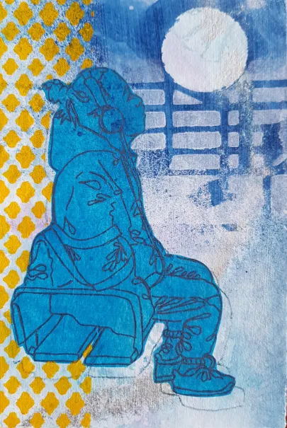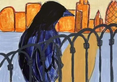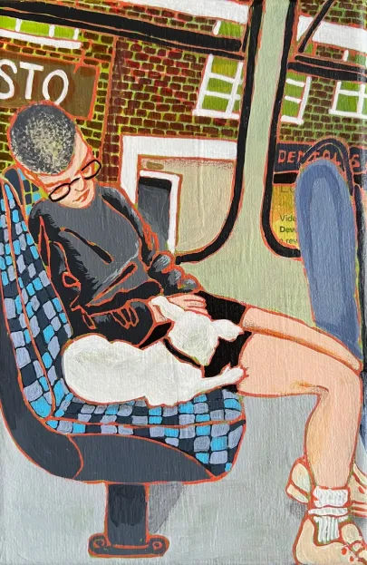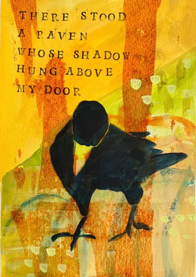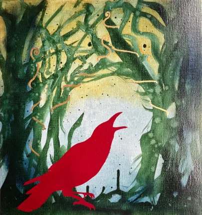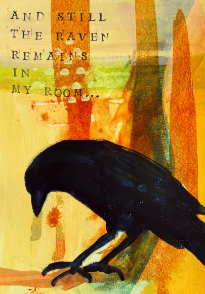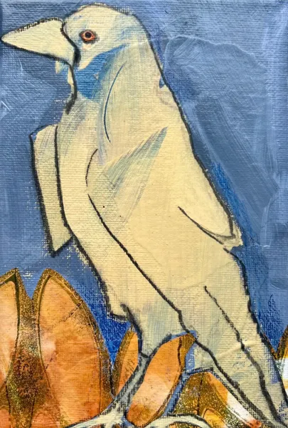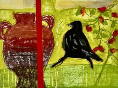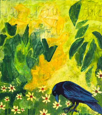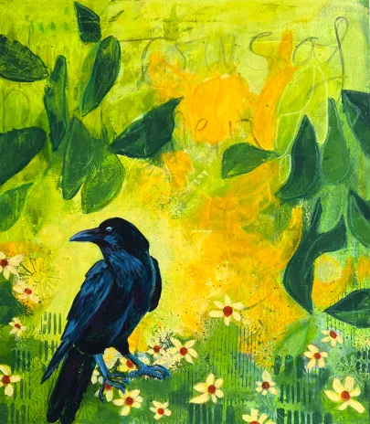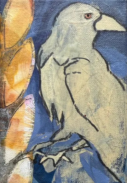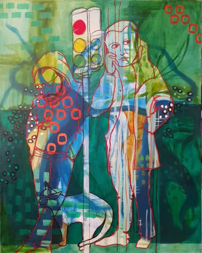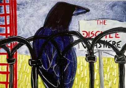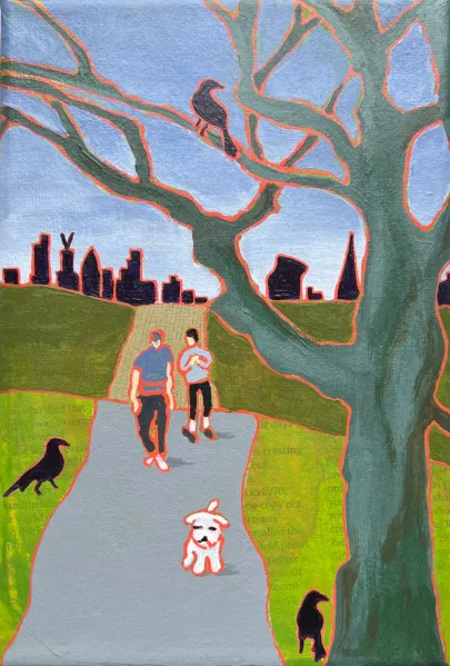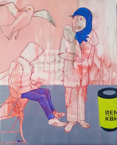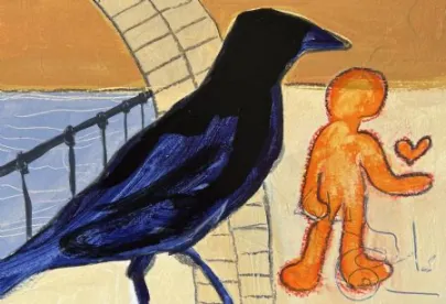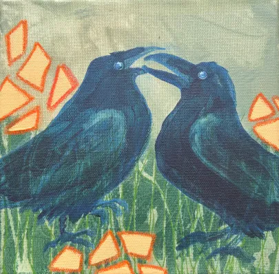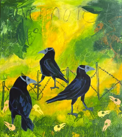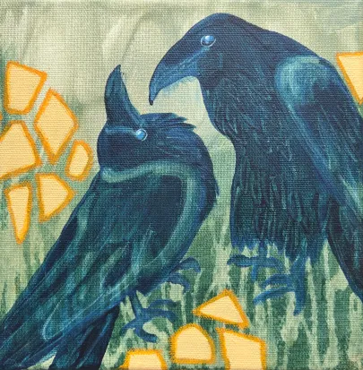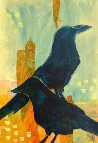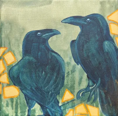 A motif that recurs in several of Helle's series is birds, more specifically corvids. We see them in "Strokes of London". Crows, rooks and ravens strut around the streets of the metropolis in search of food, while they observe the people passing by with their clever eyes. It is almost as if Helle identifies with the large black birds that are witnesses to human doings and deeds in large and small. In terms of expression, the paintings, with their graphic clarity and at the same time monumental and dynamic composition typical of the way Helle Jensen works.