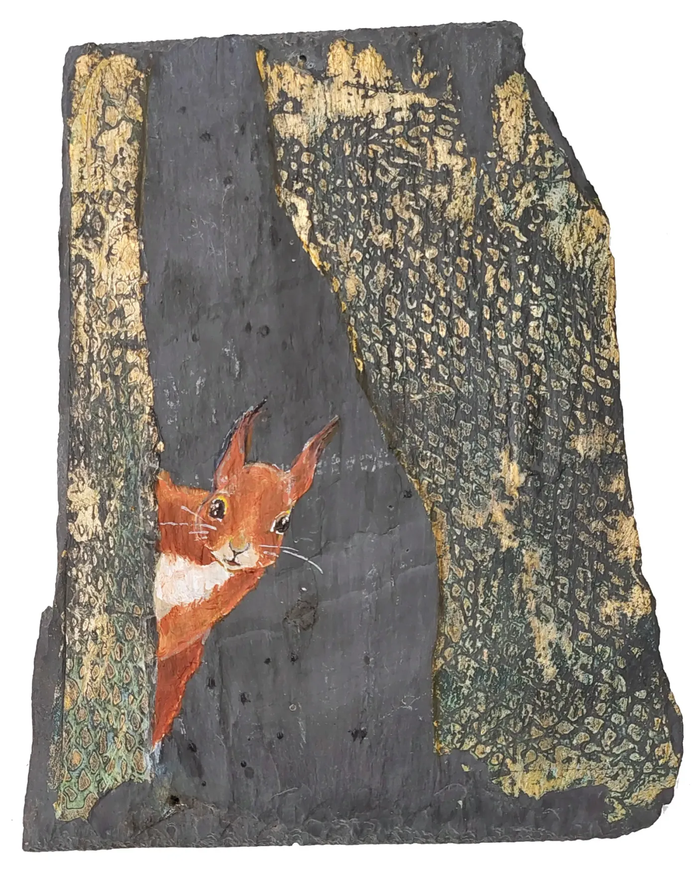 Acrylic and brass on slate (Slate roof from 1884 on Galten Church, Jutland. From Wales. 500 mill. years) Akryl og messing på skifer (Skifertag fra Galten Kirke fra 1884. Fra Wales. 500 mill. år)